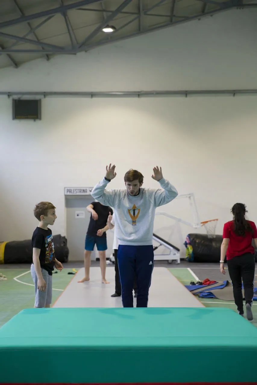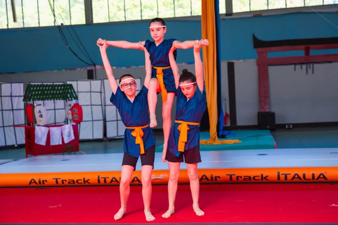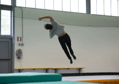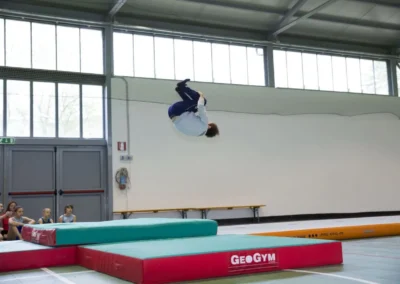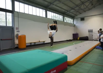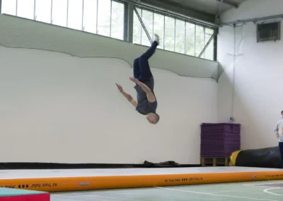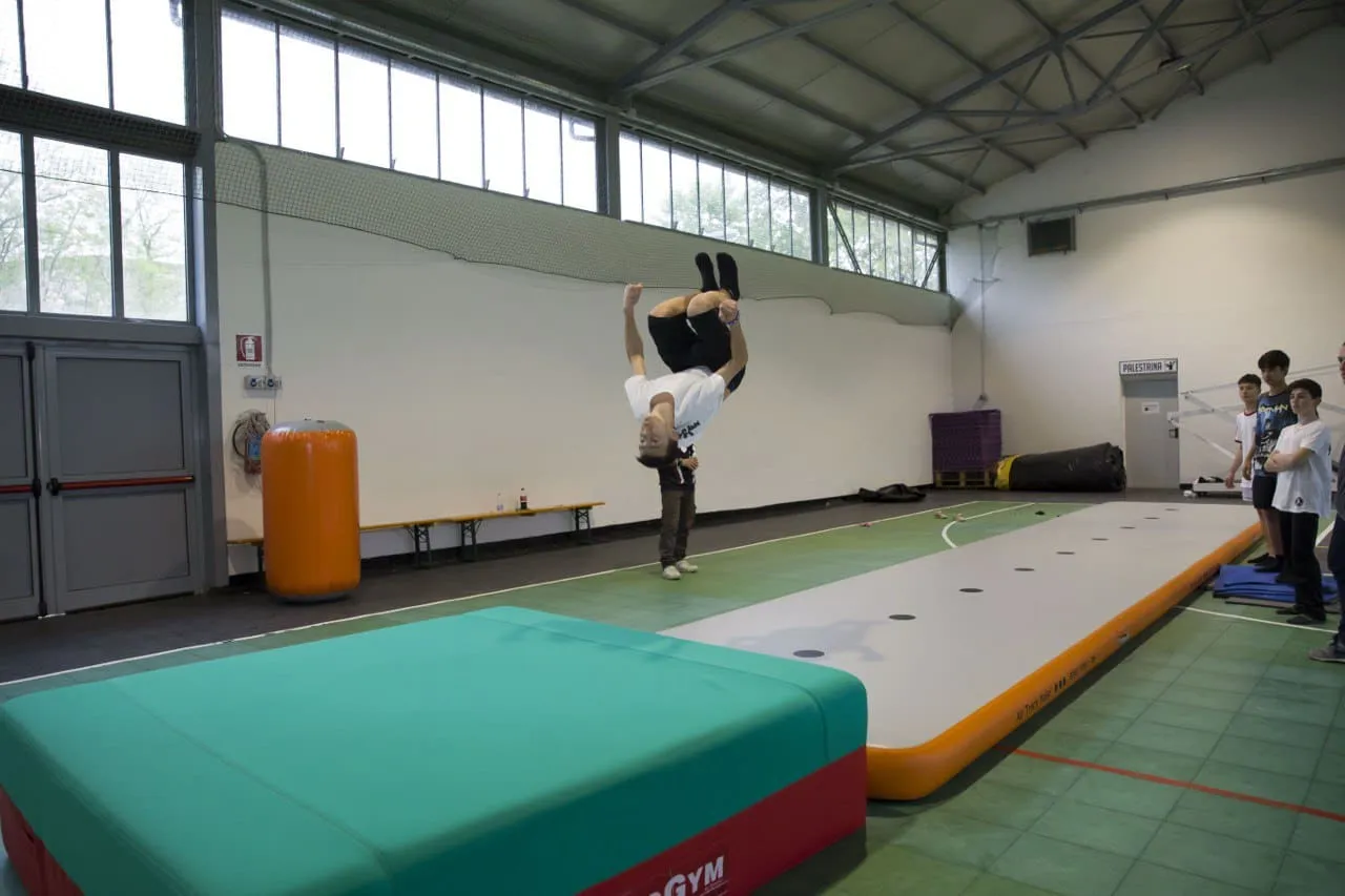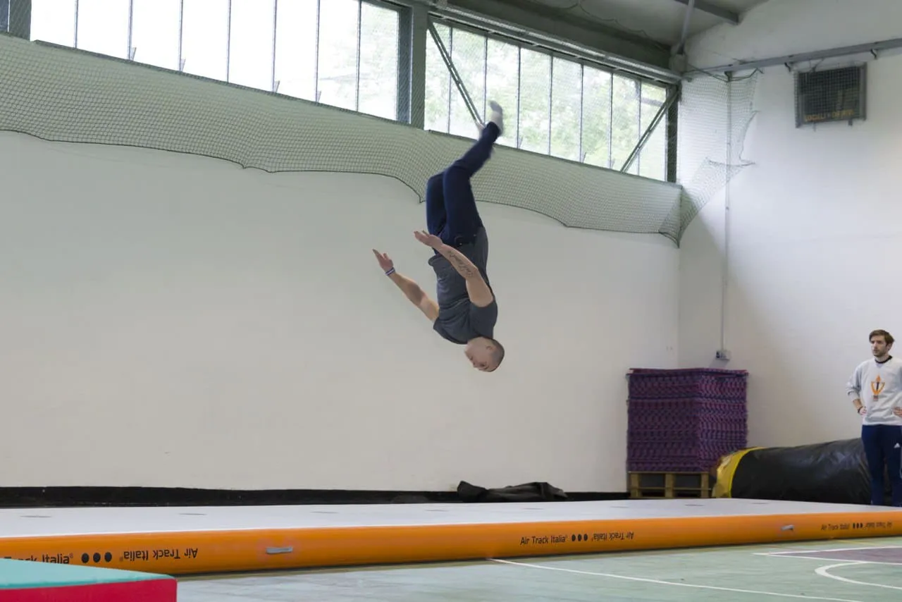 Dalle basi dell’acrobatica ai salti in combinazione, il percorso si sviluppa su tappeto airtrack, una superficie elastica e ammortizzata che facilita l’apprendimento in sicurezza.